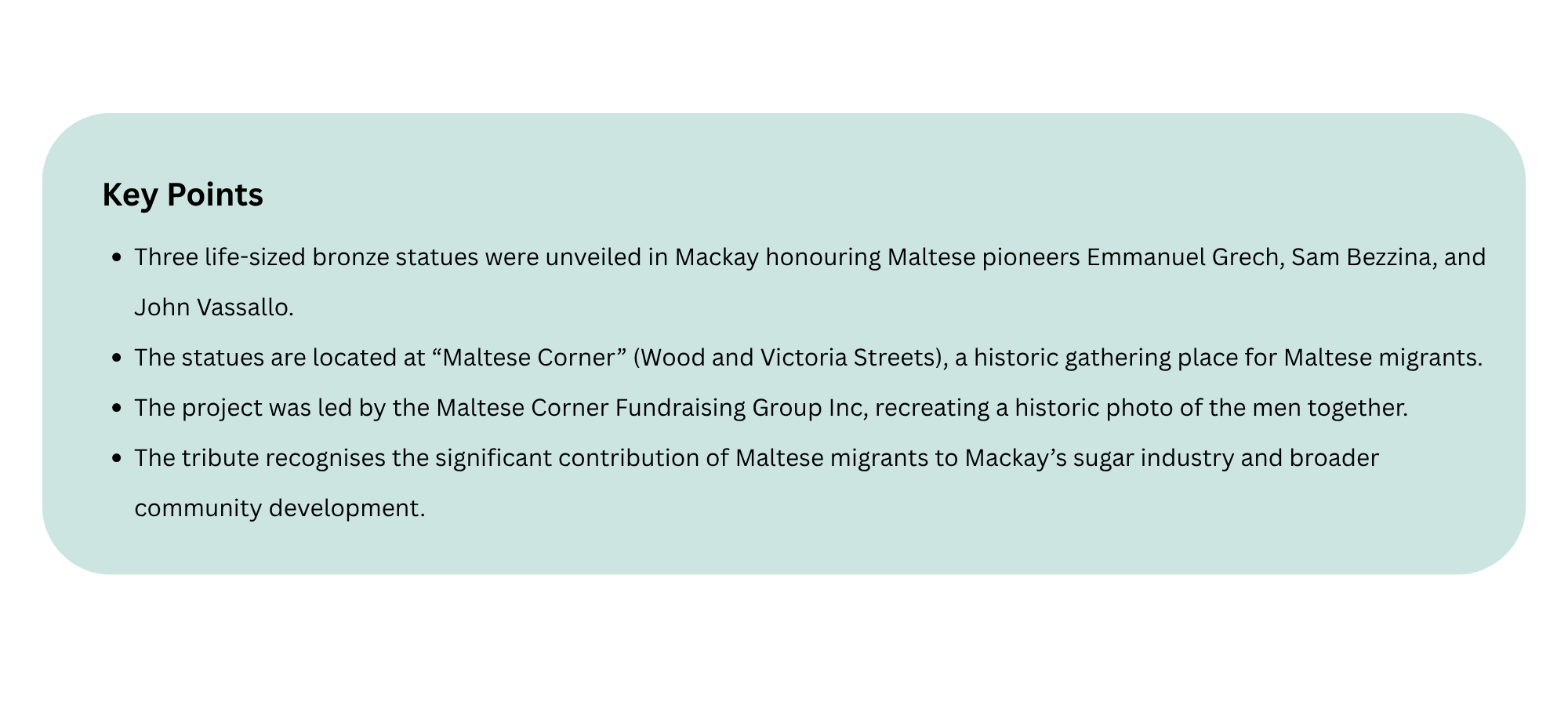 The statues of Emmanuel Grech, Sam Bezzina and John Vassallo now stand proudly on the corner of Wood and Victoria streets – a location long known locally as “Maltese Corner”, where migrant businessmen would regularly gather to talk, support one another and build their futures in Mackay.