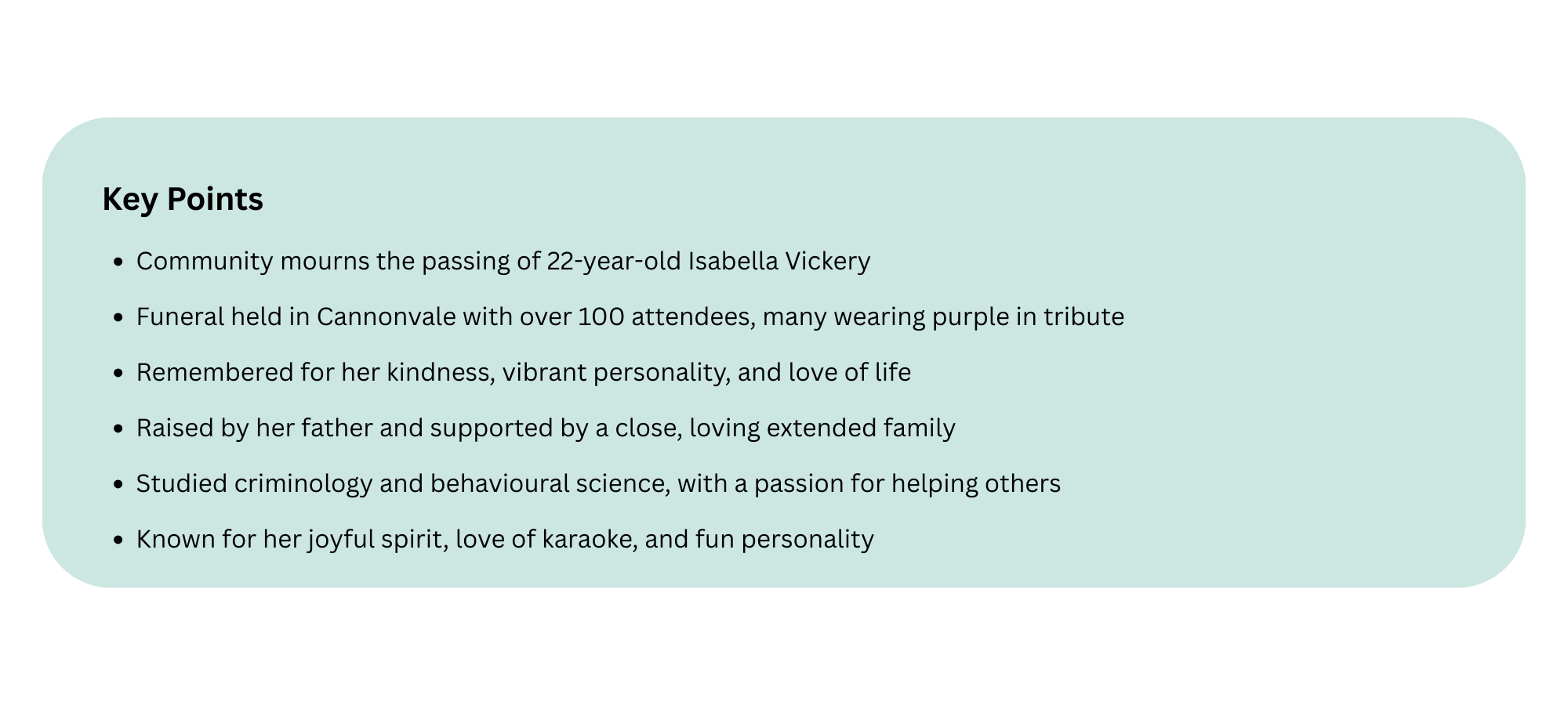 The community gathered this week to mourn the tragic passing of 22-year-old Isabella Vickery, a much-loved young local who will be remembered for her love of life, cheeky personality and kindness.