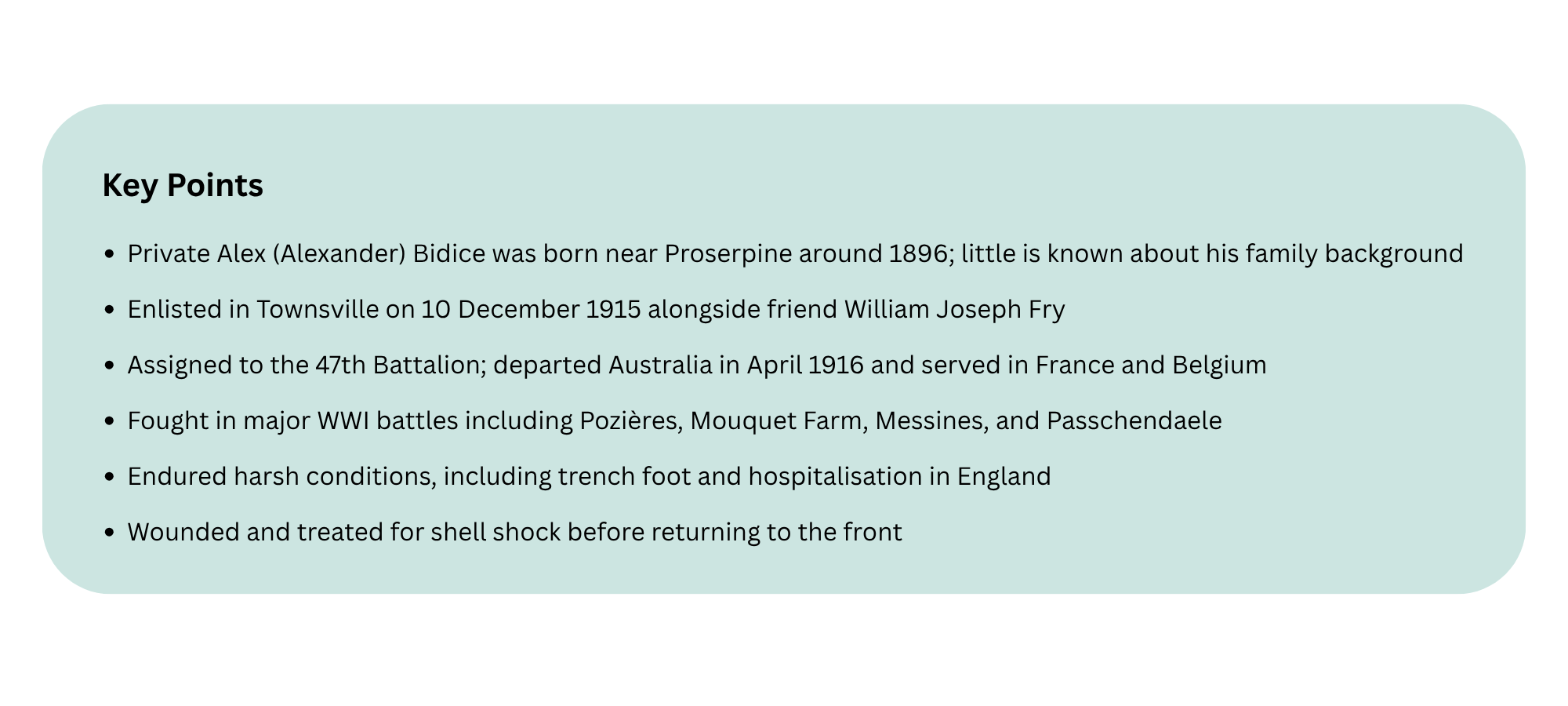 Alex Bidice was assigned to the 2nd reinforcements of the 47th Battalion leaving Sydney 20 April 1916 on the troopship, Hawkes Bay. By 3 June 1916, the 47th sailed from Alexandria to Marseilles then marched into Outterstsene and Merris, continuing their training there.