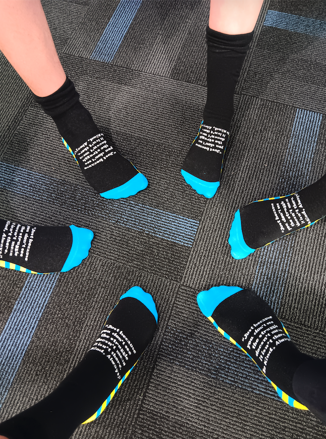 The socks are black, aligning with school uniform requirements, and feature a colourful message on the arch of the foot: “Just because you don’t see the struggles, doesn’t mean it isn’t there. Be kind always.”
