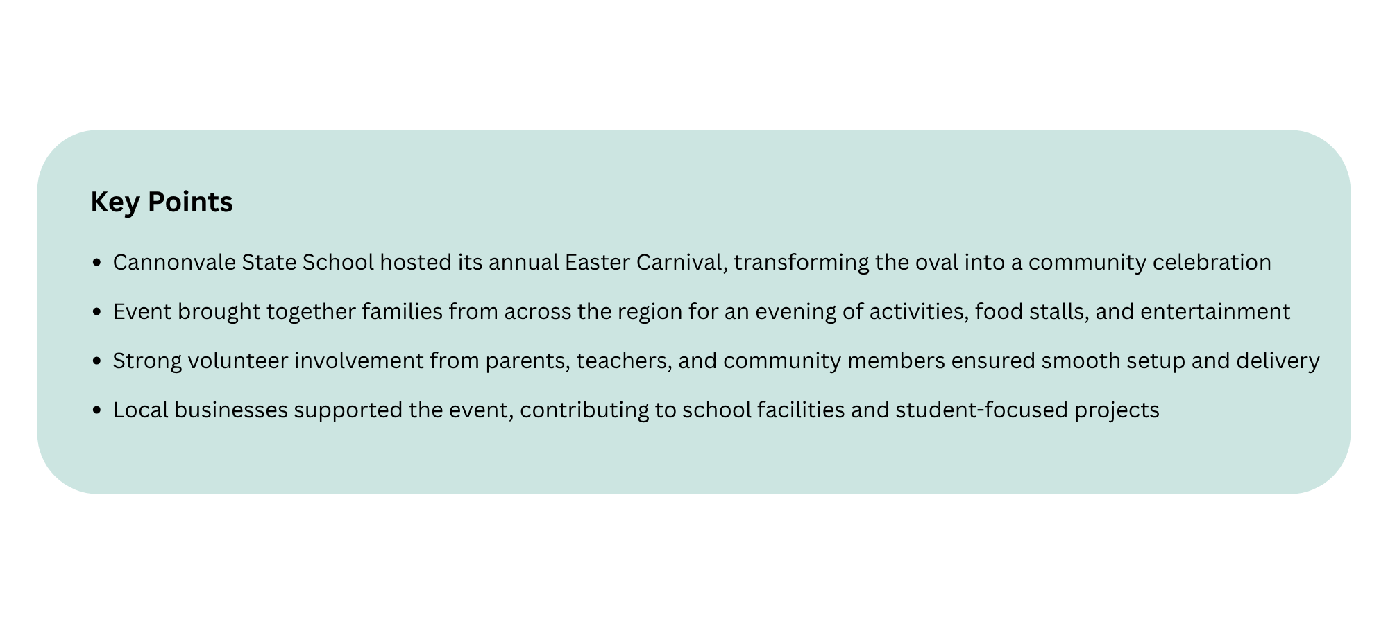 “Most importantly, thank you to everyone who came along. Seeing the oval filled with smiling faces made every bit of planning worthwhile. Your presence and enthusiasm turned a school fundraiser into a true community celebration.”