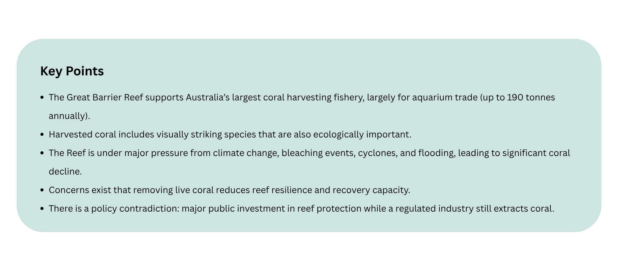 This creates an apparent contradiction. Governments have invested heavily in protecting and restoring the Reef, funding initiatives aimed at improving water quality, supporting coral regrowth, and enhancing resilience. Yet, at the same time, a regulated industry continues to extract coral from the wild.