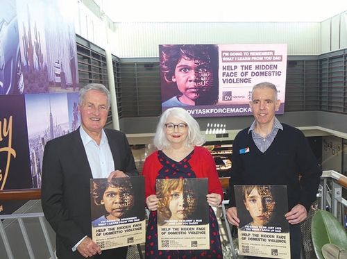 Mayor Greg Williamson, Mackay Women’s Services Executive Director Linda-Ann Northey and Caneland Central centre manager Simon De Barro launch “The Hidden Face” campaign. Photo credit: Sam Gillespie