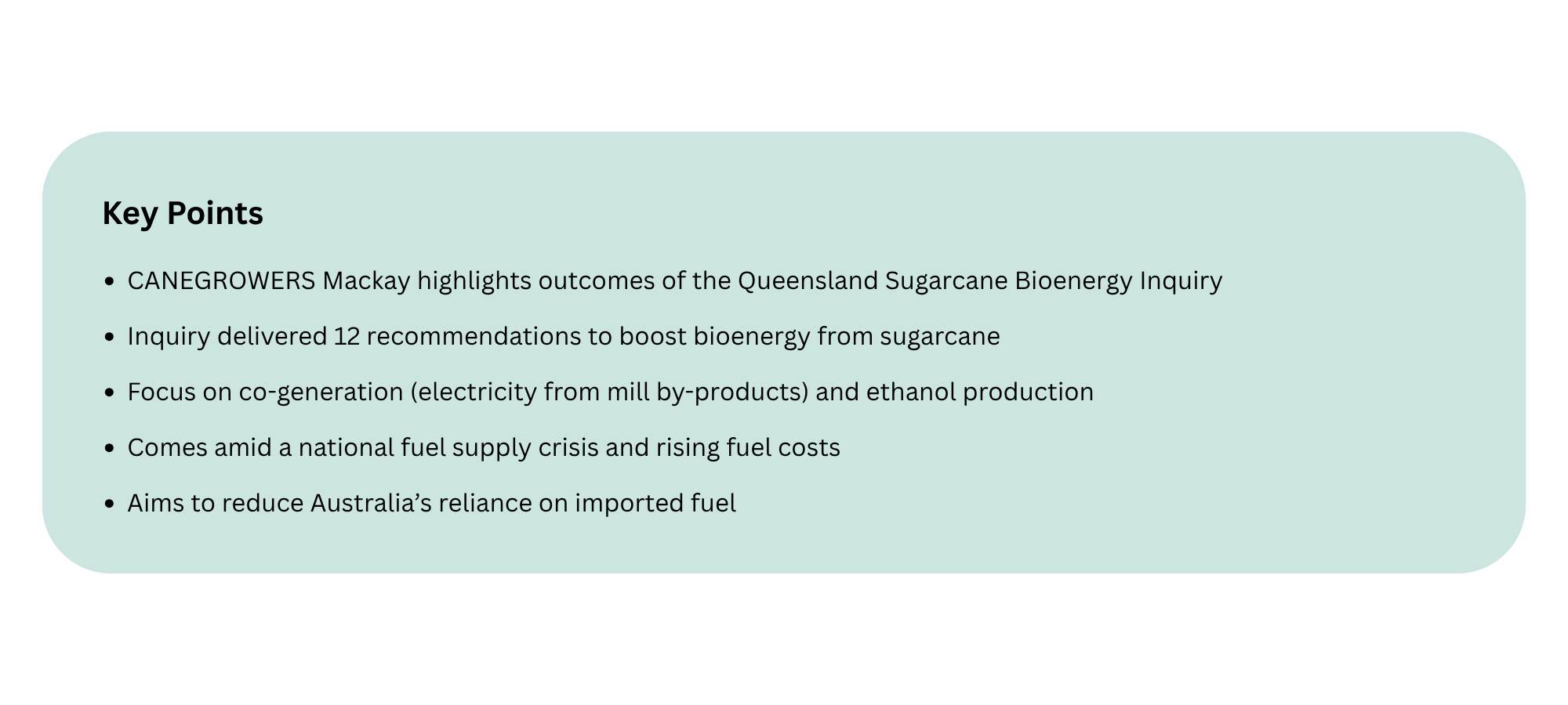 The state government launched the sugarcane bioenergy inquiry to identify how the industry could help supplement fuel supplies, reduce reliance on imports, and deliver new revenue streams for growers and millers. The findings, released against the backdrop of a national fuel crisis, could not be timelier.