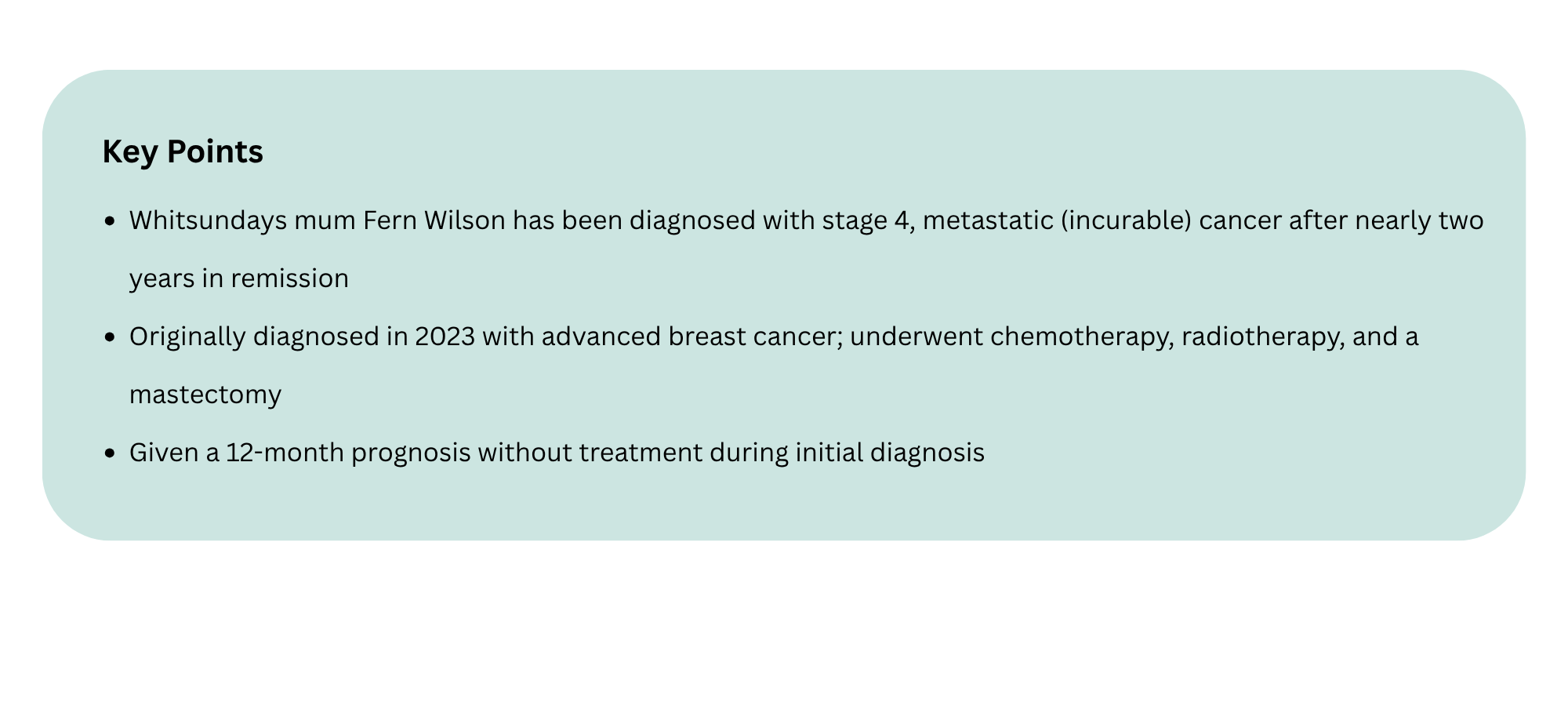 A much-loved Whitsundays mother is once again facing an unthinkable battle after learning her cancer has returned, this time incurable.