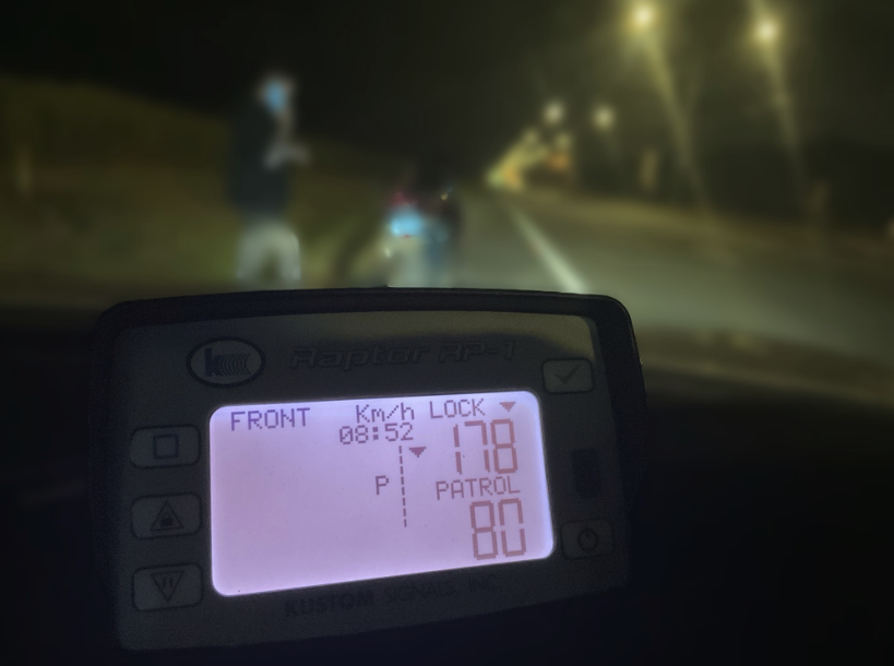 At approximately 8.49pm, officers conducting mobile speed enforcement patrols allegedly detected a Kawasaki ZX 12R motorcycle travelling at 178 kilometres per hour in an 80-kilometre-per-hour zone — 98 kilometres over the posted speed limit.