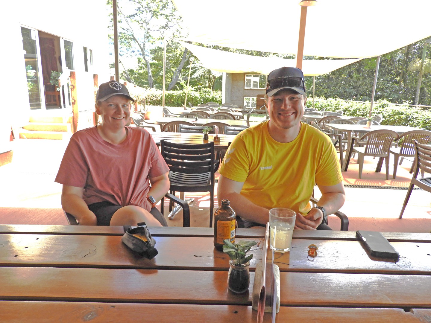 Rockhampton runners, Kristina Joergensen and Angus Campbell enjoy the post run celebrations and mini presentations at the Eungella Chalet’s outdoor dining area.