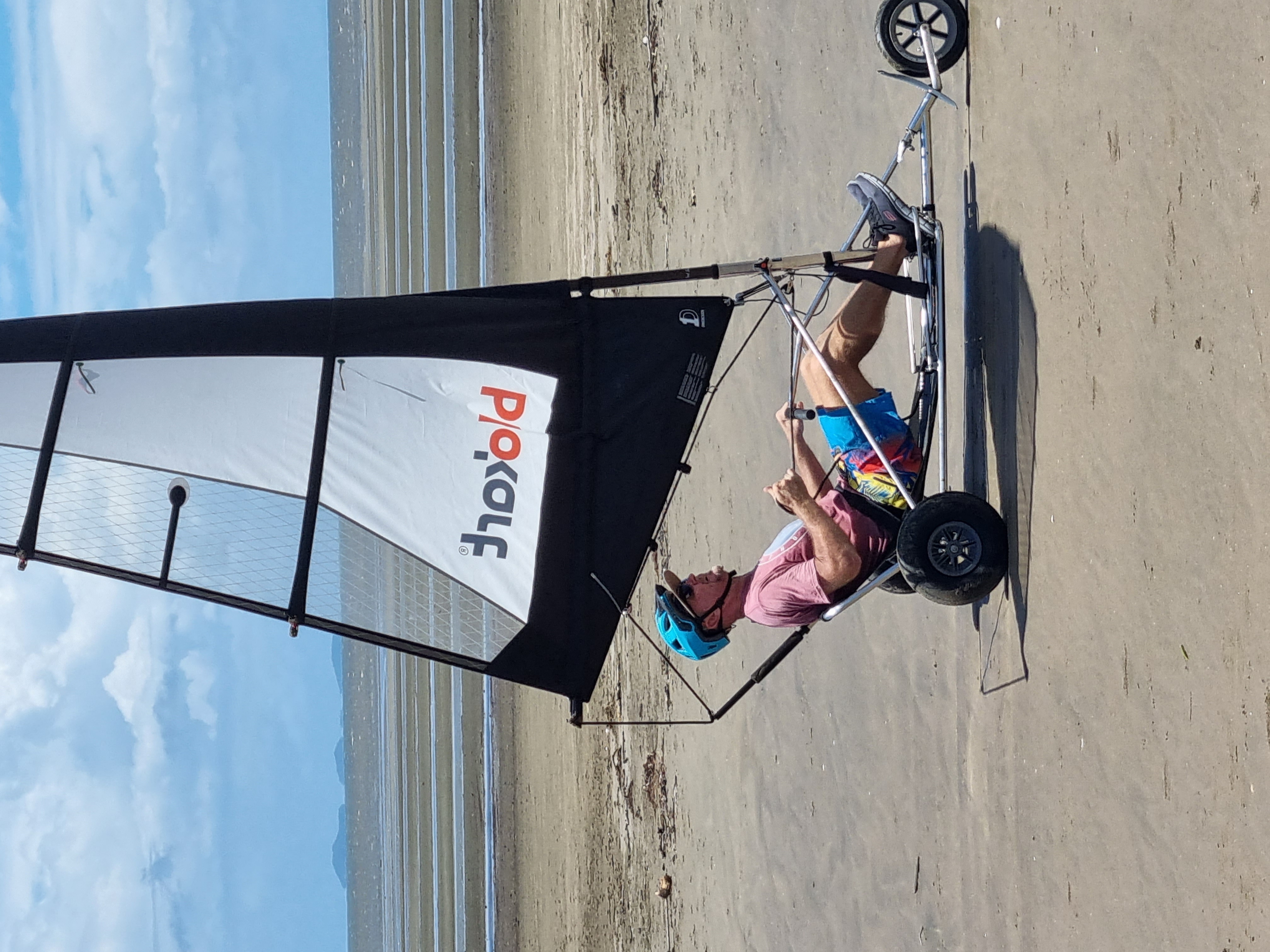 These three-wheeled land yachts have a range of sails which are selected on the day to match the wind conditions and the weight and experience of the sailor.