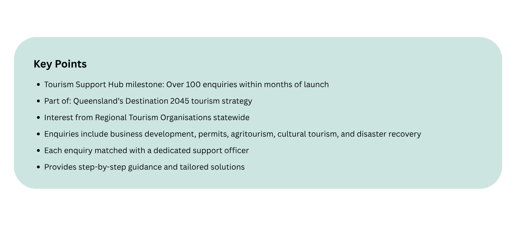 Developed under Queensland’s Destination 2045 initiative, the Tourism Support Hub has already drawn strong interest from Regional Tourism Organisations across the state, fielding enquiries spanning business development, agritourism, cultural tourism, national park permits and disaster recovery.