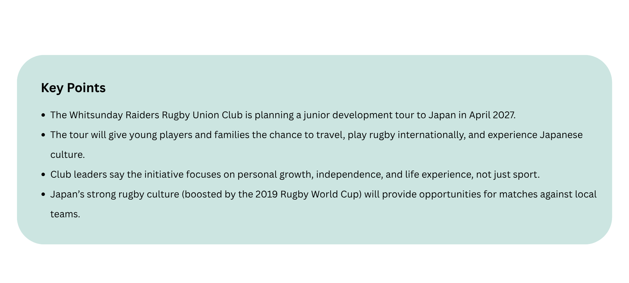 The proposed tour will see a group of young Raiders players and their families travel overseas to experience a new culture, build lifelong friendships, and represent the Whitsunday region on the international stage through rugby.