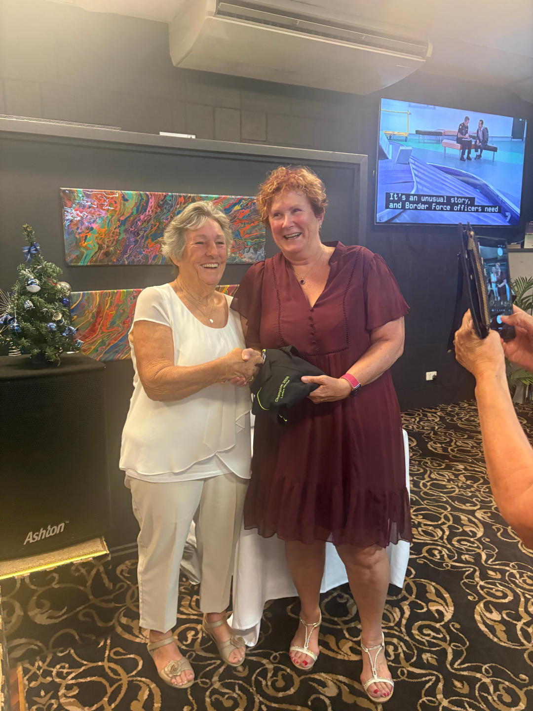 Ladies Novice Champion, Melanie Fennell, receiving her award from Ladies President, Carol Crosbie. Photo credit: Airlie Beach Bowls Club