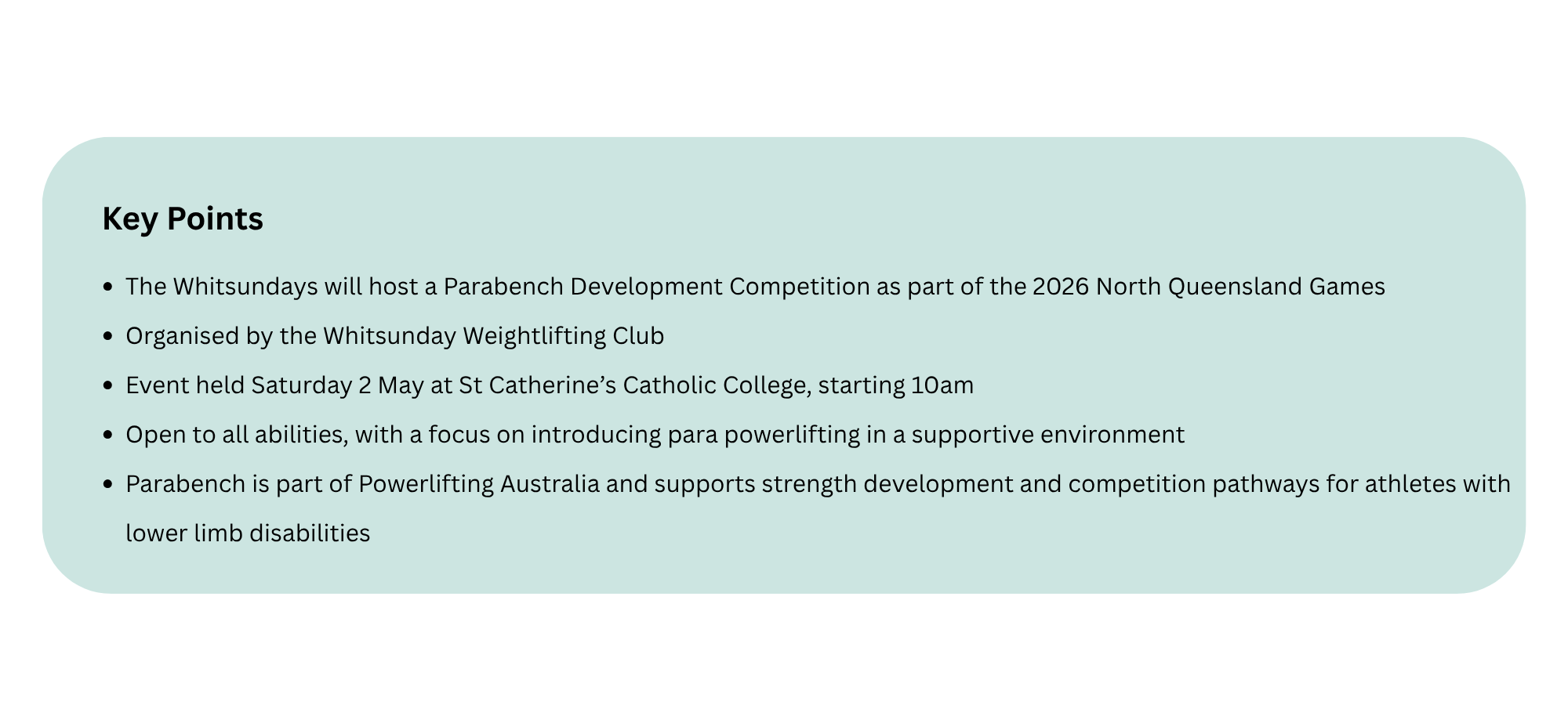 The Whitsundays is set to take centre stage in the world of para-sport, with Whitsunday Weightlifting Club hosting a Parabench Development Competition as part of the 2026 North Queensland Games — the largest multi-sport competition in regional Australia.